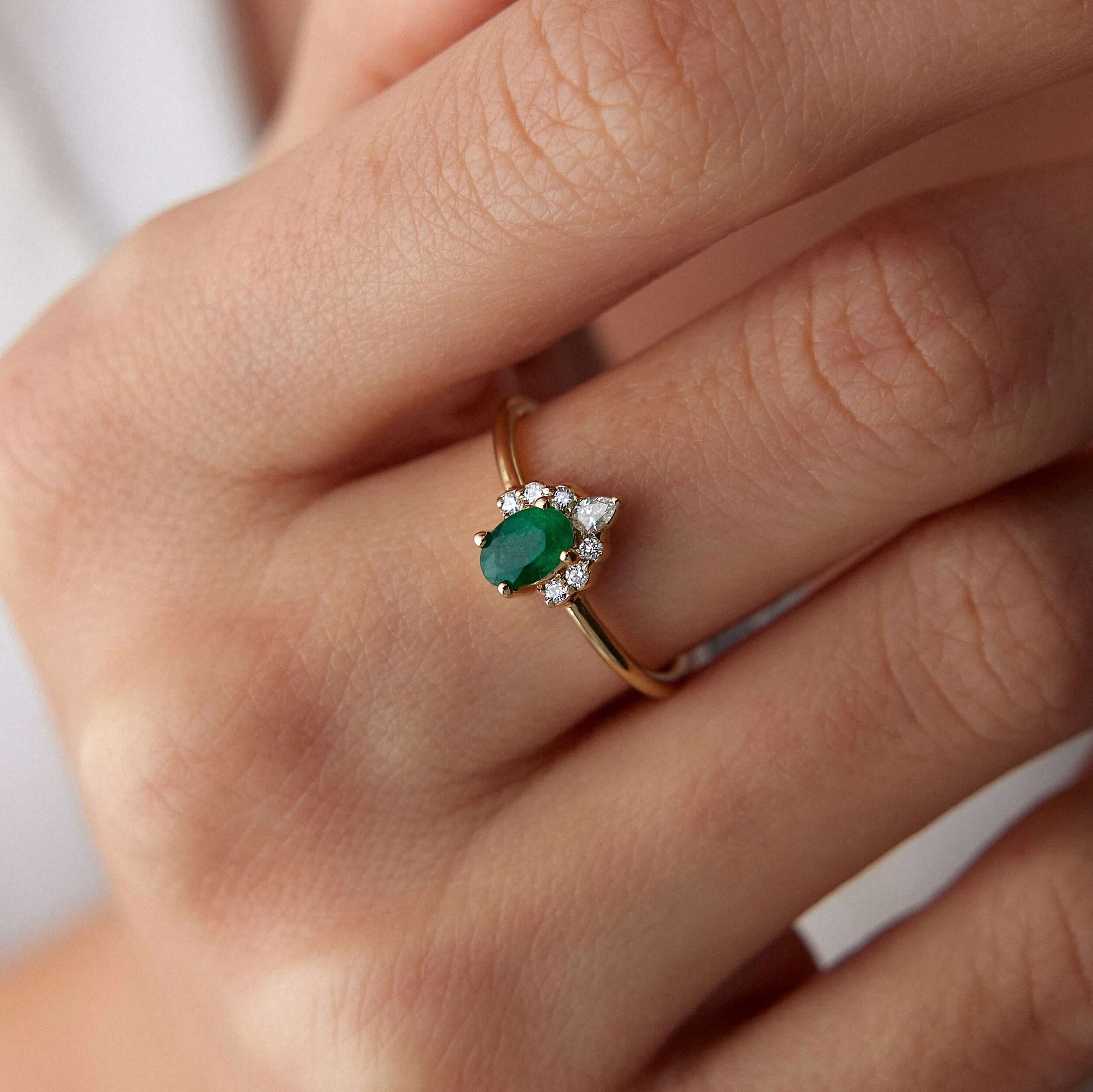 Minimal Oval Zümrüt ve Pırlanta Yüzük