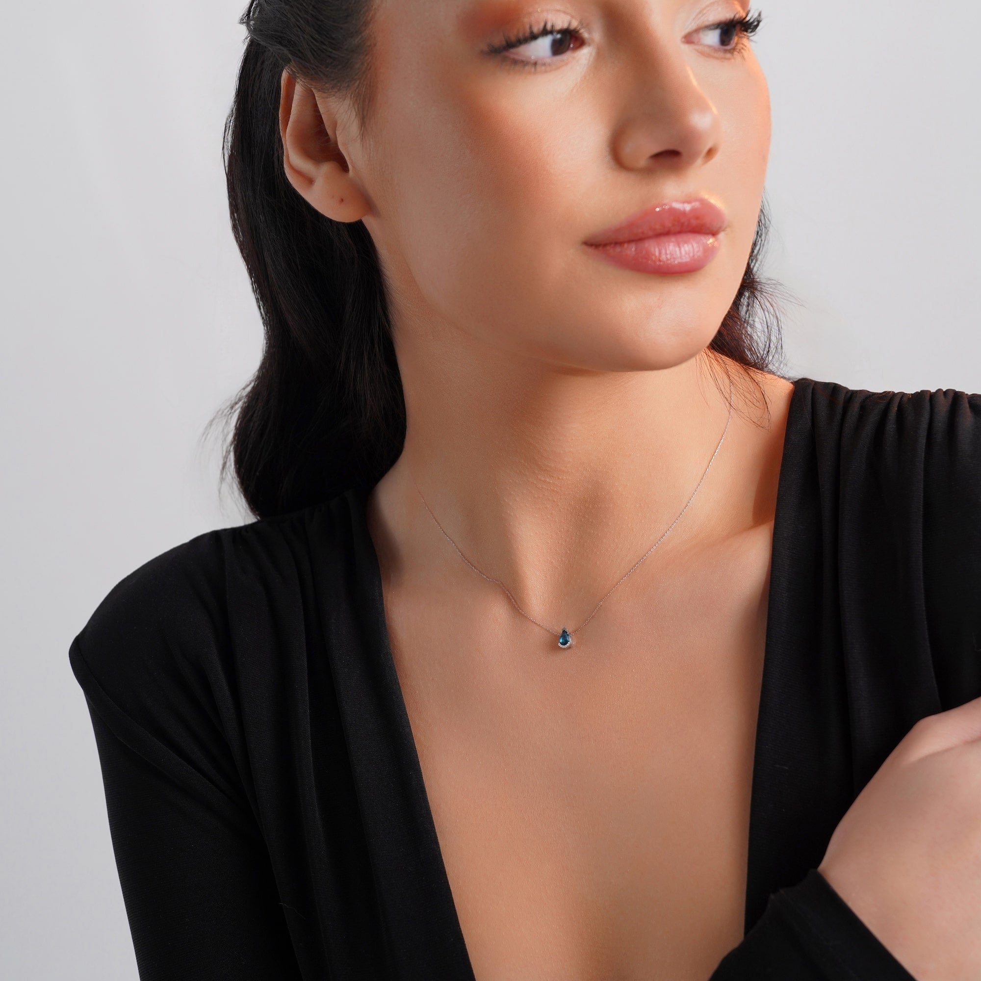 Minimal Damla Kesim Mavi Topaz ve Pırlanta Kolye